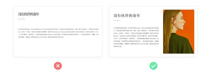 亲密性在排版中的理解,通俗的来讲就是我和你近,我们的关系就密切。图文排版的间隔大小,就是影响亲密性的主要因素。左图中一致的间隔,就会让人产生困惑,对各个标题、正文与图片的中关系傻傻分不清楚,严重影响用户阅读体验。在右图中,我们通过调整间距,把相关的标题正文图片分成了一组,这样元素之间的关系一目了然。